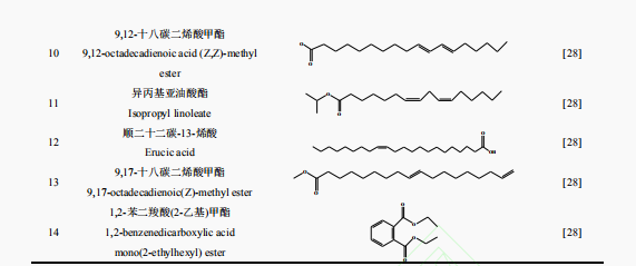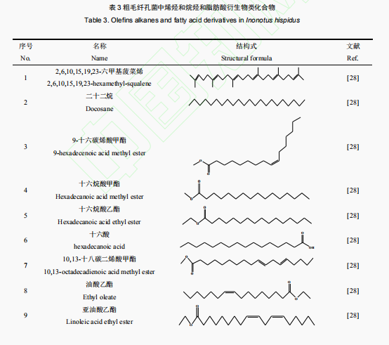 昝立峰等根據(jù)氣場(chǎng)聯(lián)網(wǎng)剖析,在粗毛纖孔野生菌實(shí)體線中評(píng)定出2,6,10,15,19,23-六羥基西蘭花烯、二十二烷和9-十六碳烯酸甲酯、十六烷酸甲酯、十六烷酸乙酯、n-十六酸、10,13-十八碳二烯酸甲酯、油酸乙酯、亞油酸乙酯、9,12-十八碳二烯酸甲酯、異丙基脂肪酸酯、順二十二碳-13-烯酸、9,17-十八碳二烯酸甲酯、1,2-苯二羧酸(2-乙基)甲酯12個(gè)油酸化合物。