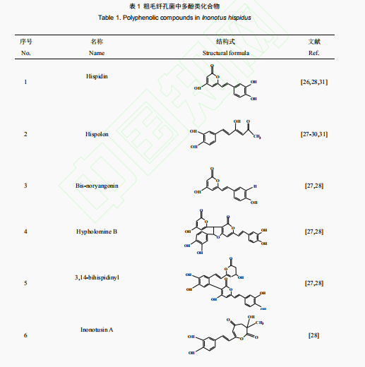 昝立峰等從內寄生于水曲柳木的粗毛纖孔野生菌實體線工業(yè)甲醇提取液中剝離獲得Hispolon、Hispidin、InonotusinA、InonotusinB、4-(3,4-二羥苯基)-3-丁烯-2-酮、InoscavinC、InoscavinD及原兒茶醛和原兒茶酸9個多酚類物質,在其中化學物質InonotusinA、Inonotusin B為2個新化學物質[28]。白楊樹東等對粗毛纖孔菌科學研究,在其工業(yè)甲醇提取液中剝離獲得多酚類4-(3,4-二羥苯基)-3-丁烯-2-酮、phellibauminA、3,3?-甲基雙[6-[2-(3,4-二羥苯基)甲基丙烯酸酯]-4-甲基-2H-吡喃-2-酮](MBP)、肌苷、原兒茶酸和原兒茶醛。李慶杰從粗毛纖孔野生菌實體線中剝離獲得5個多酚類,各自為phellibauminA、phelligridinC、phelligridinC′和phelligridinD,3?4 ?-dihydroxy-5-[11-hydroxyphenyl]-6,7-vinyl]-3,5-dioxa-fluoren-5-one。在其中phelligridinC、phelligridinC′是順反異構體,3’4’-dihydroxy-5-[11-hydroxyphenyl]-6,7-vinyl]-3,5-dioxa-fluoren-5-one(19)和反式的phelligridinC′為2個新化學物質。