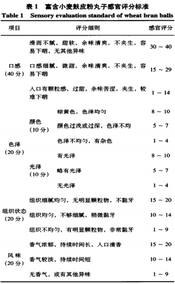 點(diǎn)評工作組為10人,五男五女,均受到技術(shù)專業(yè)的感覺點(diǎn)評學(xué)習(xí)培訓(xùn)。鑒定在感觀試驗(yàn)室內(nèi)開展,依據(jù)小麥麩皮粉肉丸子的口味、顏色、機(jī)構(gòu)模式及口味制訂感觀標(biāo)準(zhǔn)。感觀評定標(biāo)準(zhǔn)參照有關(guān)文獻(xiàn)資料并稍作改動,見表1。