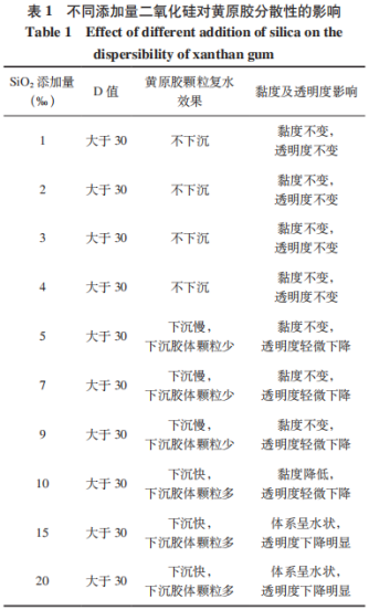 不一樣加上量SiO2對卡拉膠分散性危害的檢驗結(jié)果見表1。