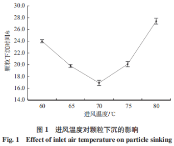 從圖1、圖2和圖3能夠看得出,送風(fēng)溫度、做霧化工作壓力和做霧化速率各自為70℃、0.3Mpa、25mL/min時,制粒商品的下移時間為最好,顯著強于別的對照組。做霧化溫度過過高加快水份流失,造成低聚異麥芽糖和卡拉膠粘合或包埋實際效果差,溫度過低水份不可以立即揮發(fā),卡拉膠會吸濕澎漲,則商品會發(fā)生發(fā)黏的狀況。做霧化工作壓力和做霧化速率會危害制粒顆粒物的尺寸及其低聚異麥芽糖與卡拉膠的粘合總面積,這種要素均會影響到中后期設(shè)備的分散性。