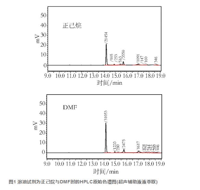 最先,在預(yù)實(shí)驗(yàn)中,不論是超聲波輔助液液萃取或是固相萃取都出現(xiàn)了一個(gè)一同狀況,即乙醚和乙醚盡管都能溶油,但在高效液相檢驗(yàn)時(shí)沒有玫瑰花茶酸的數(shù)據(jù)信號(hào)峰。正己烷、乙醚、乙醚及其DMF的正負(fù)極排列為:DMF>乙醚>乙醚>正己烷。這說明溶油實(shí)驗(yàn)試劑正負(fù)極的多少并沒有決策枙子油中玫瑰花茶酸獲取高效率的唯一要素,實(shí)際緣故尚需進(jìn)一步科學(xué)研究。因而挑選正己烷和DMF[18]開展事后試驗(yàn)。對(duì)超聲波輔助液液萃取,正己烷和DMF都是有溶油實(shí)際效果,結(jié)果如圖所示1所顯示,玫瑰花茶酸的出峰時(shí)間都在14.1 min周邊,峰形優(yōu)良且與周邊雜峰都能不錯(cuò)分離出來。