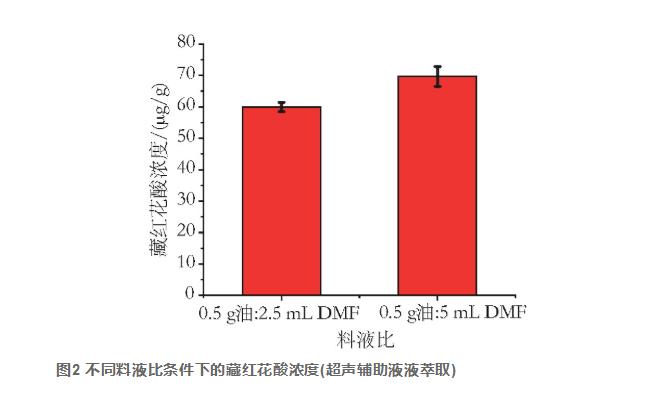超聲波輔助液液提純的研究結(jié)果顯示:隨DMF容積慢慢提升,水溶液慢慢混濁,7.5 mL以及上面的水溶液清亮度很低,不具備透光度。DMF容積在12.5 mL時(shí),水溶液離心式后不分層次。因而,DMF容積為7.5、10 mL和12.5 mL的樣本不可以開展高效液相剖析。對(duì)2.5 mL DMF和5 mL DMF的枙子油提純物開展高效液相剖析,結(jié)果如圖2所顯示:5 mL DMF時(shí)玫瑰花茶酸濃度值均值為69.65 μg/g,高過2.5 mL DMF時(shí)玫瑰花茶酸濃度值均值為59.93 μg/g。因而,在超聲波輔助液液萃取標(biāo)準(zhǔn)下,最佳料液比挑選0.5 g油:5 mL DMF。