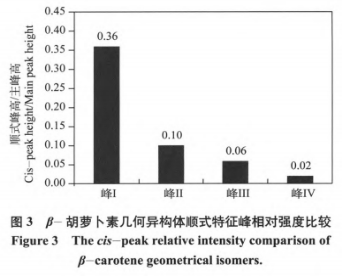 如上所述,因為分子結(jié)構(gòu)在一個烴基處發(fā)生了順式對映異構(gòu),在β-胡羅卜素的電子器件光譜圖上342~348nm處會發(fā)生一個峰(消化吸收段)。這一峰被稱作“順式峰”(cis-peak)。分子結(jié)構(gòu)中產(chǎn)生順式對映異構(gòu)的部位被稱作“cis-band”。與此同時,與全反式同分異構(gòu)體較為,順式同分異構(gòu)體主消化吸收峰的最高消化吸收光波長(λmax)也會出現(xiàn)輕微的“紫移”。圖3中的I、Ⅱ、Ⅲ及Ⅳ號峰的電子器件光譜圖圖在λmax=342~347nm上下與全反式同分異構(gòu)體的光譜儀較為能夠見到有顯著的峰存有,詳細圖2;圖3為順式峰的絕對高度;與此同時,與Ⅳ號峰的光譜儀較為,I、Ⅱ、Ⅲ號峰光譜儀主消化吸收峰和順式消化吸收峰的λmax;各自發(fā)生了5~6nm和1~4nm的“紫移”,見圖4。這種光譜儀特點的轉(zhuǎn)變帶來了將I、Ⅱ、Ⅲ號峰評定為β-胡蘿l、素順式同分異構(gòu)體的直接證據(jù)。
