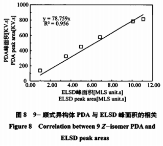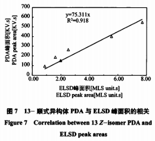 紀錄不一樣含量的13-順式同分異構(gòu)體、9-順式同分異構(gòu)體和全反式同分異構(gòu)體試品在PDA和ELSD上的峰總面積。二者之間表明出正線性相關(guān)(見圖7~圖9)。